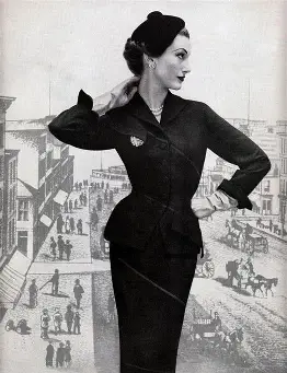 With WWII came rations, and suddenly, fashion was all about utility. The ‘40s suit was practical: squared shoulders, knee-length skirts, and simple colours. Think “Rosie the Riveter” vibes, but in a suit. There was nothing extra about these outfits, just solid, structured, no-frills tailoring. The look said, “I can work, I can run a household, and I can rock shoulder pads like no one’s business.”